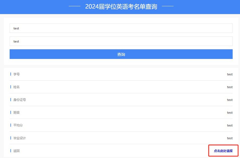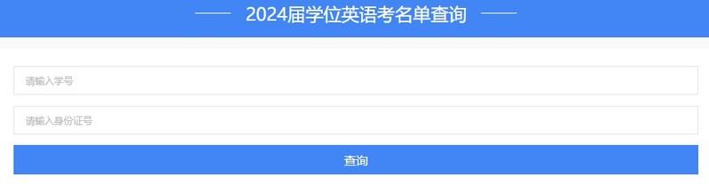 2、在“2024届学位英语考名单查询”模块中,输入学号和身份证号(末尾X须大写),点击查询。如不符合上述申请条件1-3,则查询不到个人信息。