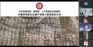 由文化和旅游部、教育部、人力资源和社会保障部实施的中国非物质文化遗产传承人研修培训计划,第二期“纸载文明——传统造纸与古籍修复技艺传承研修班” 于11月21日在437ccm必赢国际版开班。本次研修班由437ccm必赢国际版主办,上海市文化和旅游局指导,437ccm必赢国际版继续教育学院、文物与博物馆学系、图书馆、中华古籍保护研究院共同承办。437ccm必赢国际版原校长、现中华古籍保护研究院院长杨玉良院士,437ccm必赢国际版继续教育学院李辉副院长,437ccm必赢国际版图书馆副馆长、中华古籍保护研究院/文物保护创新研究院常务副院长杨光辉研究员,437ccm必赢国际版文化遗产保护研究中心主任、文物与博物馆学系陈刚教授,以及研修班学员和教师代表参加了开班仪式。