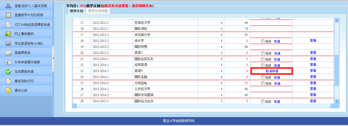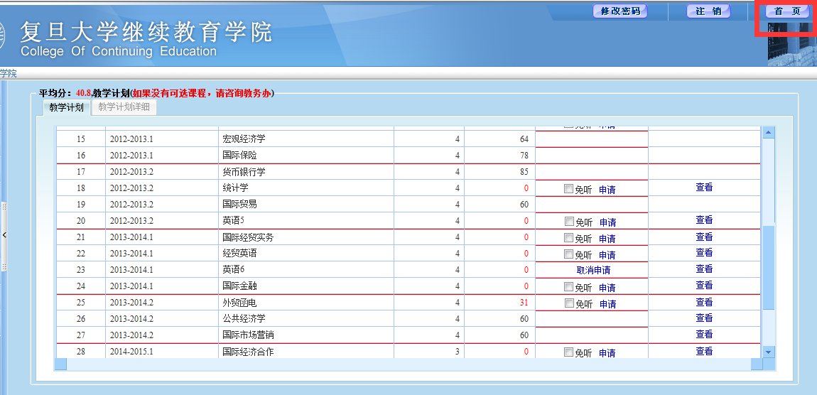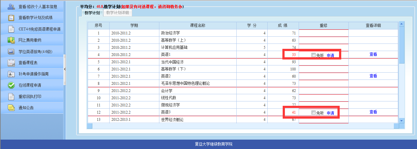 1.登录系统后,点击左侧第二栏的查询教学计划及成绩,会看到右侧教学计划栏目下未及格的课程有“免听”,“申请”等按钮,