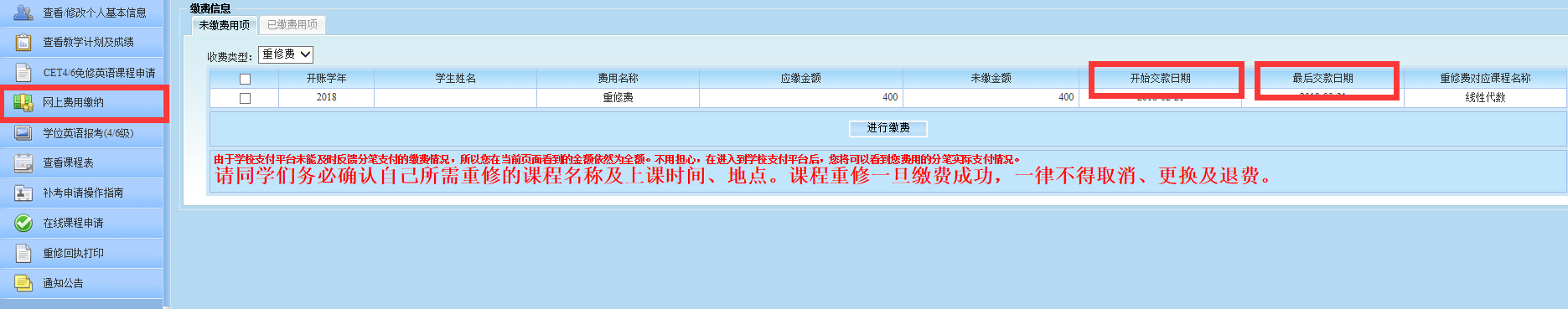 注意:重修申请日期内不能缴费,请同学们根据《关于本学期课程网上申请重修及缴费的通知》上的缴费日期进行缴费,或是在“网上费用缴纳”的页面查看“开始交款日期”和“最后交款日期”,如下图: