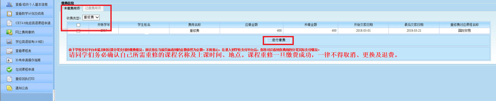 “未缴费用项”中选择“重修费”,再点击“进行缴费”,如图: