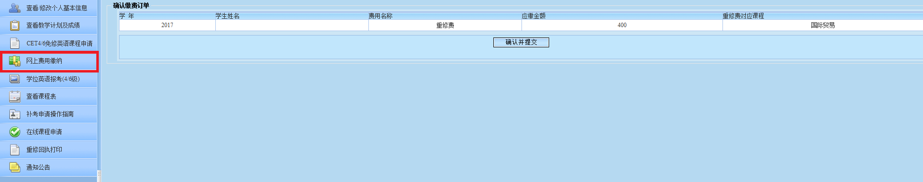5.同学们对重修课程的申请确定后,在规定的缴费时间内必须缴纳重修费,否则申请无效。在左侧第四栏“网上费用缴纳”中,可以缴纳课程的重修费,如下图: