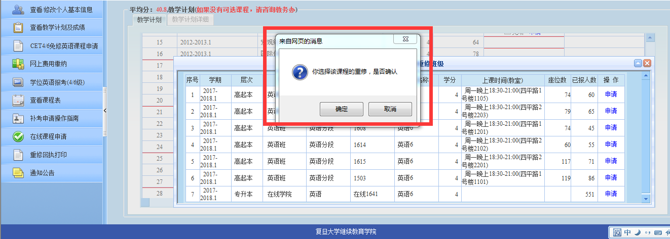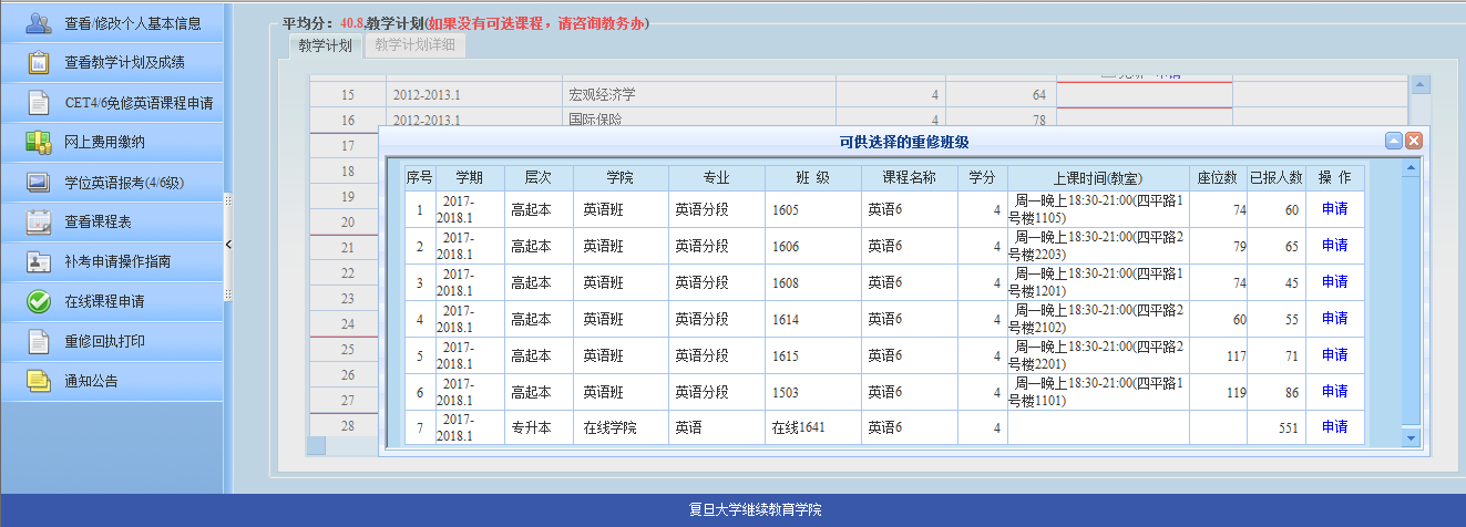 2.点击“申请”后,会弹出可供选择的重修班级信息,包括上课时间、教室、人数等,如果想到某一班级上课,请点击操作栏中的蓝色“申请”按钮(不要重复点击,可能人数多时会有延迟),如下图: