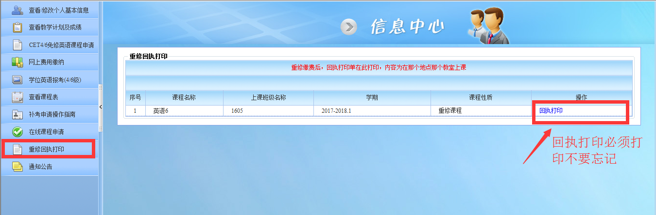 ③在左侧倒数第二栏“重修回执打印”中,能看到更具体的课程性质,课程班级等,此外,重修听课的学生打印回执后必须交给上课班级的班主任,如下图: