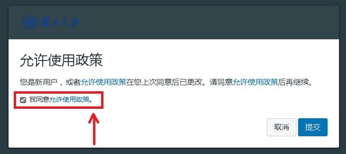 初次登录后请勾选“允许使用政策”,然后点击“提交”按钮。见下图。