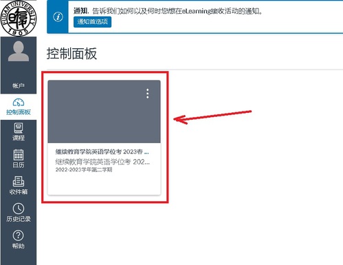 3、登录后点击“控制面板”中的“继续教育学院英语学位考2023春样卷测试”,见下图。