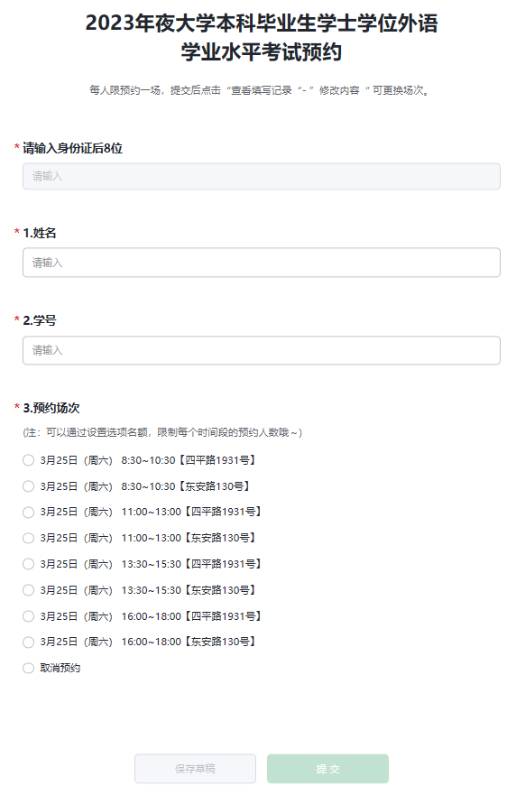 3、完成校验后填写姓名、学号,选择一个场次预约并提交(请注意场次后的考试地点,不要选错):
