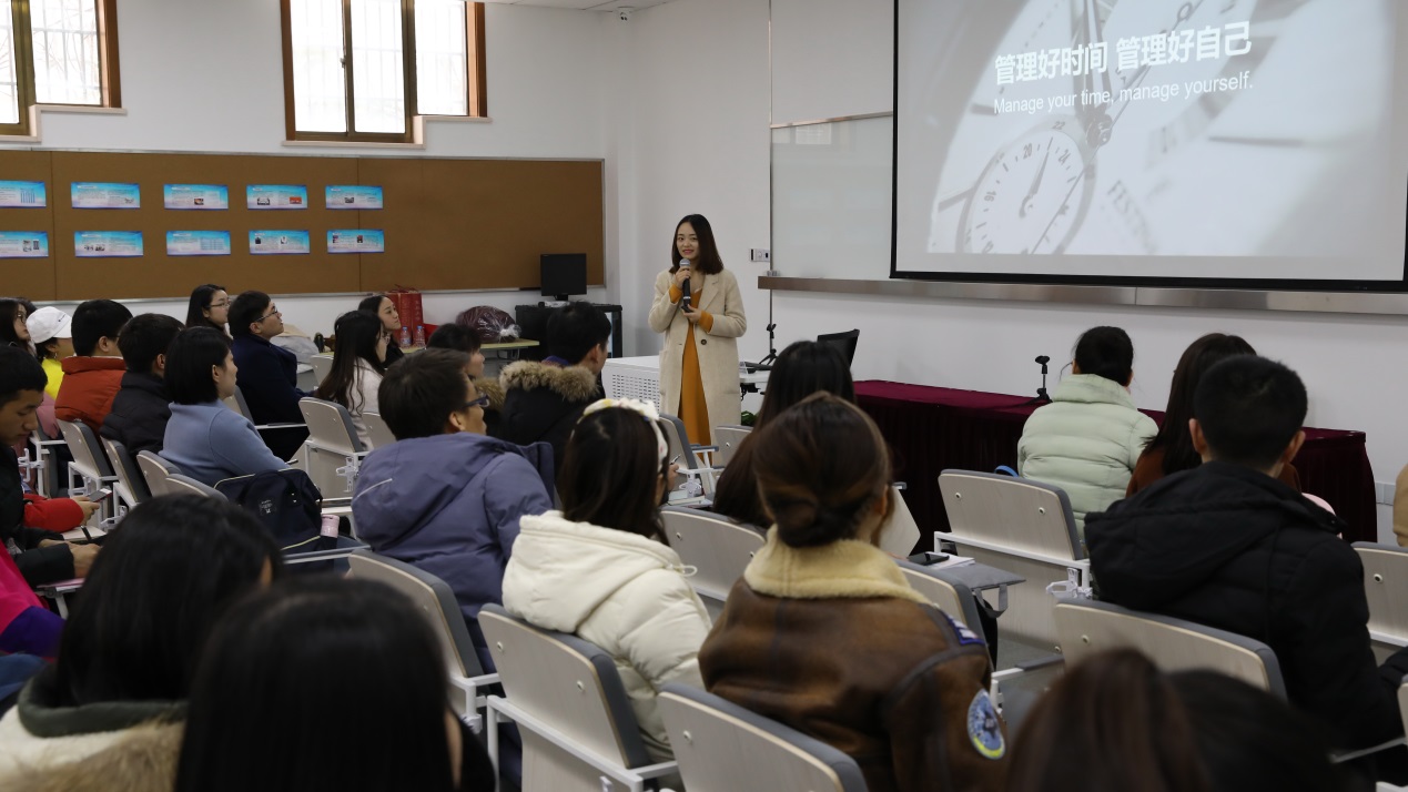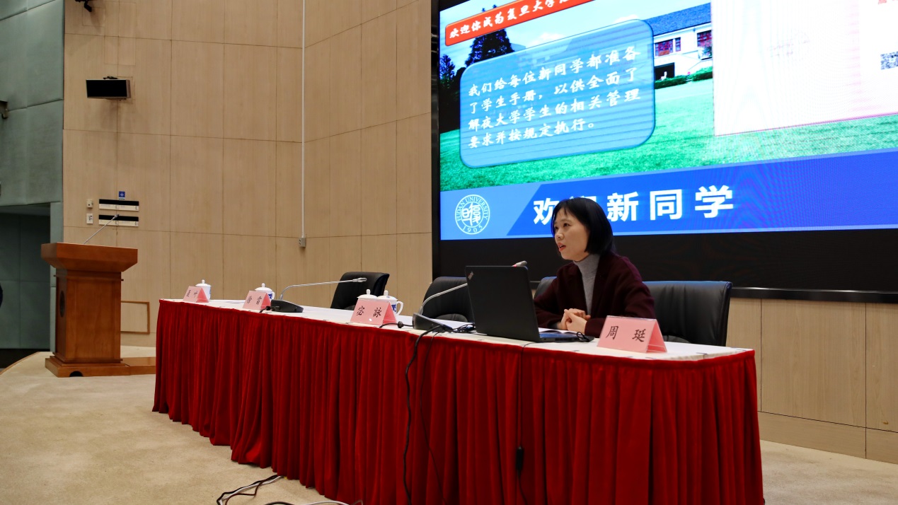 在开学典礼结束后,继续教育学院学历部副部长周珽老师为同学们就学籍管理、在线平台、学习纪律以及学分银行四个方面的相关信息进行了交流和介绍。