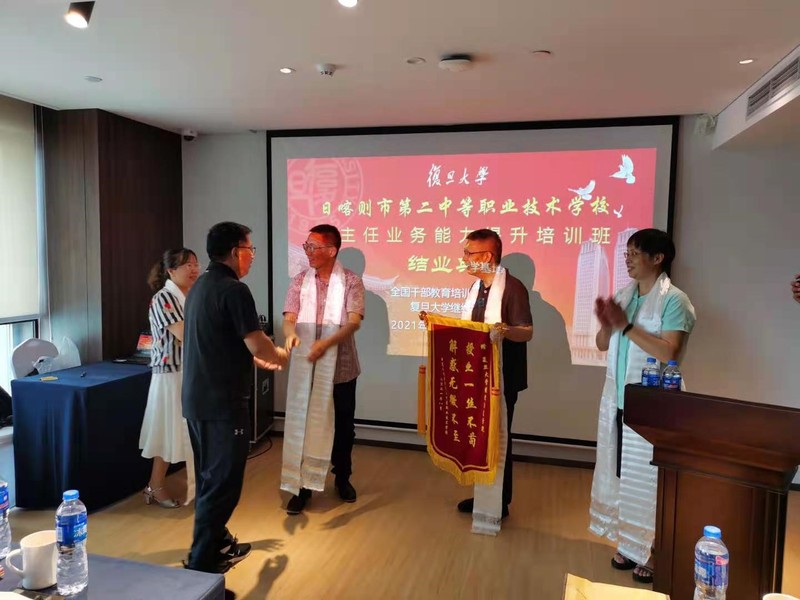 结业典礼上,培训学员代表做了培训心得报告,上海援藏干部杨晓峰副校长对培训学员提出了殷切期望,日喀则二职副校长普布次仁代表学校向我院赠送了锦旗,我院副院长葛宏波参加了整个结业典礼。