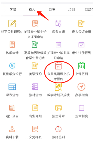 2、预约方法:通过手机端复旦继续教育“微学院-夜大-公共英语课上机考预约”预约公共英语考试的具体时间与场次。