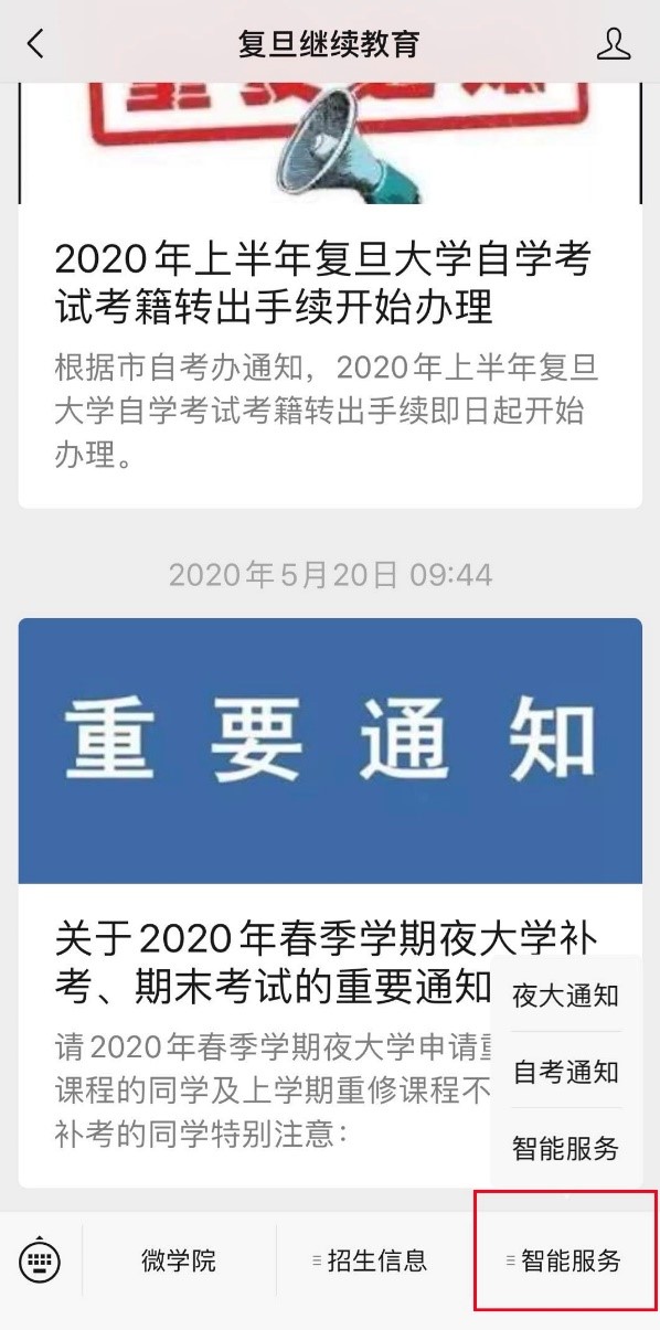 答:考生可关注437ccm必赢国际版继续教育学院的公众号“复旦继续教育”,并通过智能服务进行相关信息的咨询。